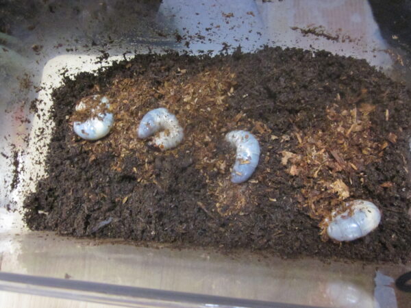 自宅に戻り、ケースでカブトムシ用のマットを敷いて、幼虫たちをそこ放つと、あっという間にマットに潜り込みます。